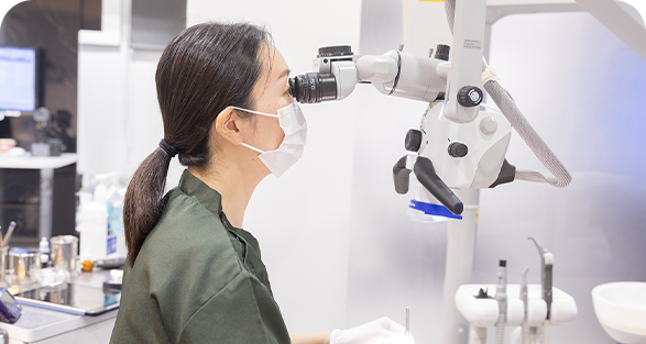 根管内は非常に細かく、肉眼では確認が難しいため、マイクロスコープを活用することで、再発のリスクを低減し、精度の高い治療が可能となります。また、治療中の感染を防ぐために、ラバーダムを使用し、唾液や細菌の侵入を防ぎます。