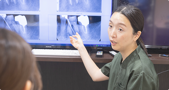 初診時にはお口全体を丁寧に検査し、個々に合わせた治療計画をご提案します。マイクロスコープを活用した精密な根管治療や、矯正・インプラント治療にも対応しています。