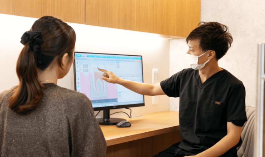 初診時には、レントゲンや口腔内写真を使って一緒にお口の状態を確認します。写真を見ながらどこに問題があるか等をご説明し、治療の内容や進め方を分かりやすくお伝えします。